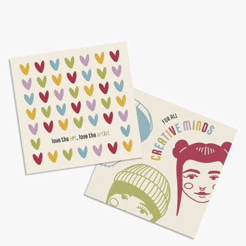 Bunte Visitenkarten auf einem farbenfrohen, orangenen Hintergrund.