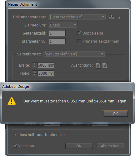 Des Weiteren kommt hinzu, dass Layoutprogramme wie beispielsweise InDesign oder Illustrator beschränkt sind in der Größe ihrer Dokumente. So beträgt bei InDesign die maximale Breite bzw. Höhe 548,64 cm, bei Illustrator knapp 578 cm. Große Werbetechnik-Produkte wie Planen im Wunschformat ab 4 m müssen deshalb im Maßstab 1:10 erstellt und an die Online-Druckerei angeliefert werden. Damit die effektive Auflösung von 100 – 150 dpi garantiert wird, benötigen verwendete Bilder im Layout dementsprechend auch eine zehnmal höhere Auflösung. In der Druckdatei also konkret 1000 – 1500 dpi.