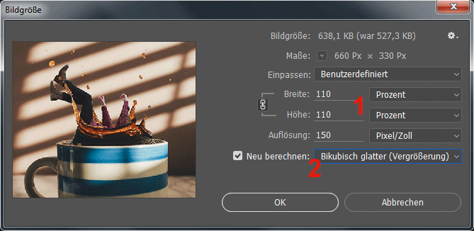 Vergrößern Sie Ihr Foto in kleinen Schritten um jeweils maximal 10 Prozent. Da bei einer Vergrößerung jedes Mal Pixel hinzugefügt werden, indem der durchschnittliche Farbwert benachbarter Pixel ermittelt wird, gehen weniger Details verloren, je kleiner diese Vergrößerung ist. Wählen Sie dazu Bild > Bildgröße und stellen Sie bei Breite und Höhe 110 Prozent ein (1). Unter „Neu berechnen“ wählen Sie „Bikubisch glatter“ bzw. „Details erhalten“ (2), um einer Qualitätsminderung möglichst effektiv entgegenzuwirken.