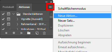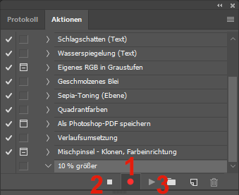 Im Aktionenfenster erscheint das Aufnahmesymbol nun rot (1). Wiederholen Sie die oben genannten Schritte im Bildgröße-Fenster und klicken Sie, sobald diese abgeschlossen sind, auf das quadratische Stop-Symbol (2). Der Vorgang ist nun aufgezeichnet und kann über das dreieckige Play-Symbol (3) beliebig oft mit nur einem Klick durchgeführt werden.