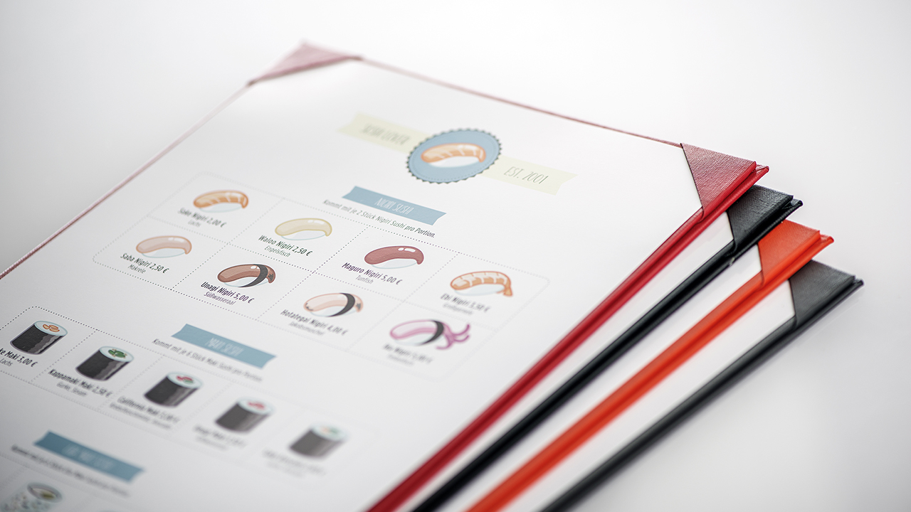 Wir haben zunächst vier Systeme in verschiedenen Ausführungen online gestellt. Klassische Menükarten mit ein oder zwei Seiten, Deckelkarten, also Speisekarten für mehrere Seiten, und Clipboards, in mehreren Größen und Farben. Alle sind sie aus hochwertigen Materialien wie Leinen oder robusten Kunststoffen und für den täglichen Gebrauch natürlich gut zu reinigen. Und: Sie werden alle in Handarbeit in Deutschland gefertigt. Bis auf die Clipboards können sie individuell gestaltet werden und wir bedrucken dann in der gewohnten FLYERALARM Qualität. Die Auflagen beginnen bereits bei 10 Stück, das Preis-Leistungs-Verhältnis ist schon in dieser kleinen Menge unschlagbar.