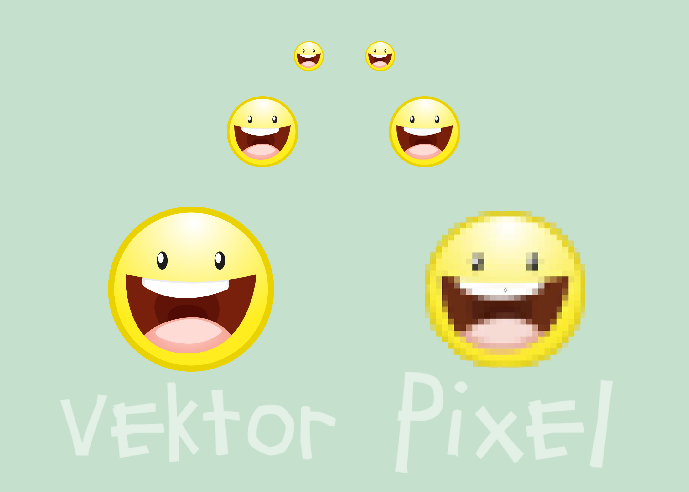 Den Begriff Vektor kennen die meisten wahrscheinlich noch aus dem Mathe-Unterricht. Und tatsächlich ist eine Vektorgrafik eine Art mathematische Formelsammlung. Aus den Informationen von geometrischen Figuren wie Linien, Kurven, Kreisen oder Polygonen entstehen Grafiken, die zu einem komplexeren Bild zusammengefügt sind. Dabei werden keine Pixel, sondern Pfade gespeichert, die zum Beispiel die Informationen zu Größe und Farbe enthalten. Diese Pfade können verändert werden, ohne dass ein Qualitätsverlust entsteht. Vor allem bei einer Vergrößerung wird hier der Unterschied zu Pixelgrafiken deutlich. Eine Vektorgrafik kann beliebig vergrößert werden, ohne an Schärfe einzubüßen. Die gespeicherten Angaben werden auf die neue Größe umgerechnet und die Figuren entsprechend gezeichnet. So eignen sich Vektorgrafiken besonders für Logos oder Icons, die oft in verschiedenen Größen gebraucht werden. Weil das Bild dadurch nicht mehr, sondern nur geänderte Informationen enthält, wird auch die Datei nicht größer.
