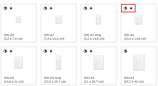 Wenn Sie die Optionen Same Day oder Overnight nutzen möchten, muss jede Komponente Ihres Produktes damit kompatibel sein. Welche dies sind, erkennen Sie ganz leicht an den entsprechenden Symbolen oben links in den zur Verfügung stehenden Formaten, Materialien, Veredelungen, etc.