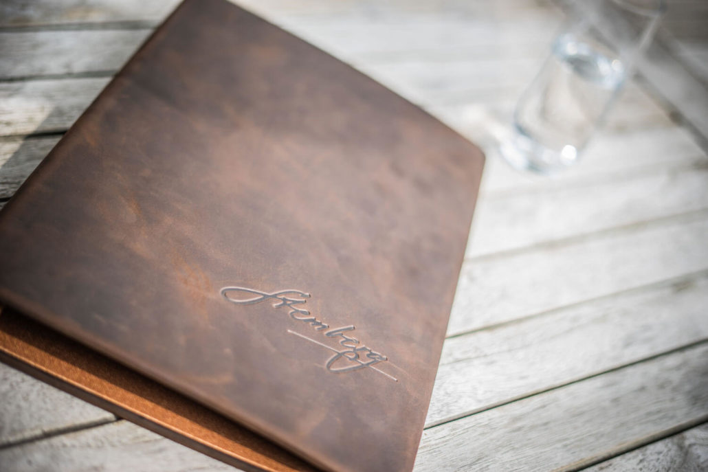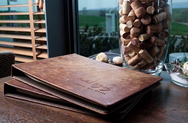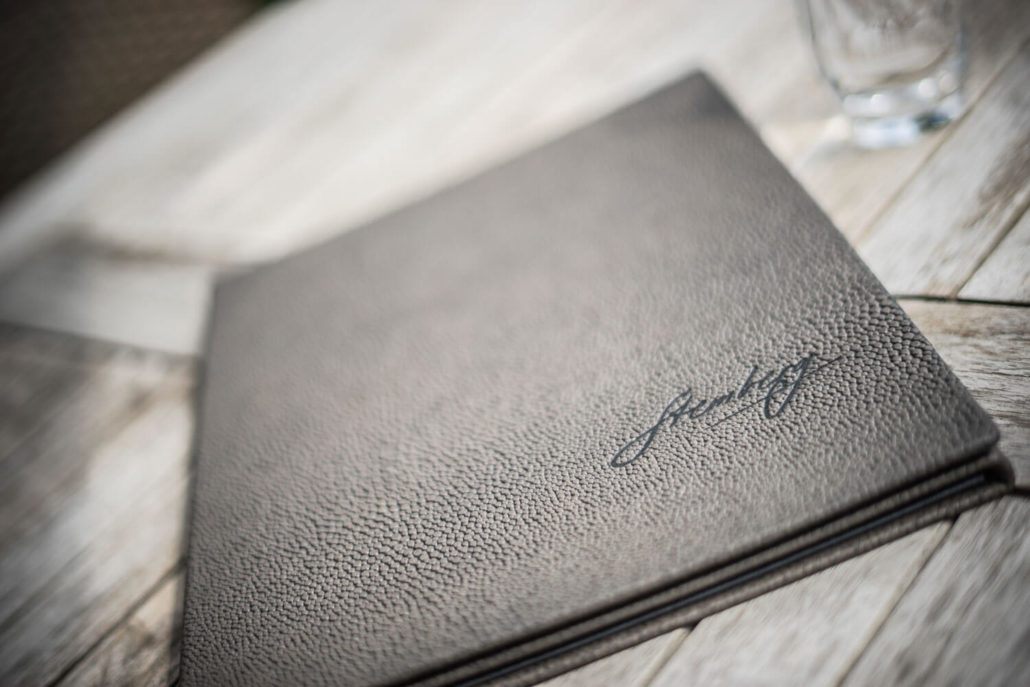 Auch das Sternerestaurant „Haus Stemberg“ im Bergischen Land hat sich von den Spezialisten von FLYERALARM Menu Design Unterstützung geholt. Passend zum hauseigenen Weinkeller ist in penibler Handarbeit eine Weinkarte aus feinstem Kalbsleder samt Blindprägung und Naturleinenbezug für den Innenteil entstanden. Für die Speisekarte wählten Andrew J. Kormanec und seine Kollegen, natürlich in enger Absprache mit den Restaurant-Betreibern, ein Premiumleder mit feinperliger Struktur, das enorm widerstandsfähig und dennoch hochwertig und edel ist.