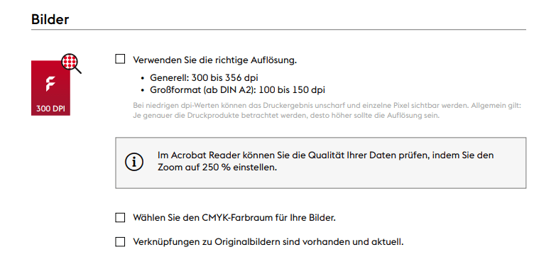 Bei allen Pixelgrafiken, also Bilder oder mit Bildbearbeitungsprogrammen wie Photoshop erstellte Druckdaten, ist eine ausreichend hohe Auflösung von elementarer Wichtigkeit. Die absolute Auflösung Ihres Layouts und sämtlicher enthaltener Grafiken und Bilder sollte, je nach Druckprodukt, etwa zwischen 300 und 356 dpi liegen.