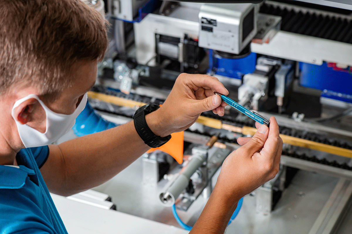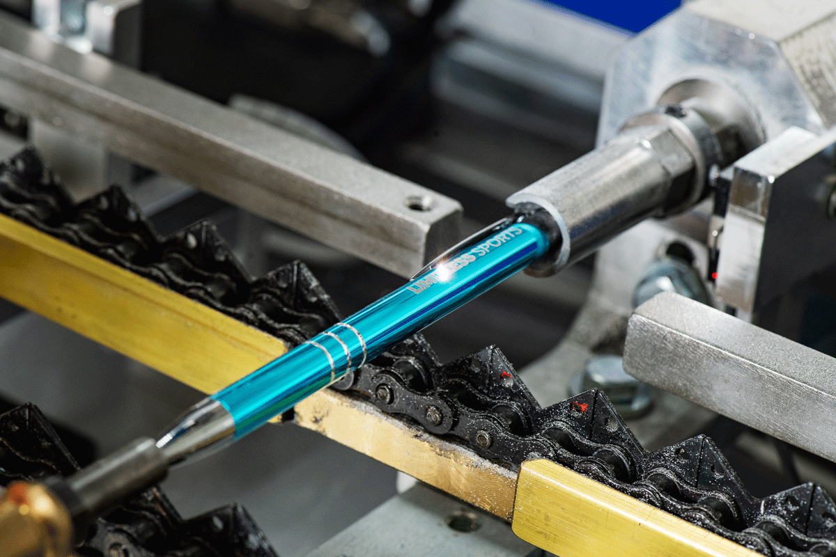 Beim Lasergravieren werden mittels Laserstrahl – also stark gebündeltem Licht – die obersten Schichten eines Materials sehr stark erhitzt und dadurch partiell abgetragen. Abhängig von der Dauer der Bestrahlung verdampft oder verbrennt das Material dabei. Bei FLYERALARM werden zahlreiche Werbeartikel am Standort Würzburg individuell mit Laser graviert – neben Thermobechern und Glaskaraffen zum Beispiel Kugelschreiber: