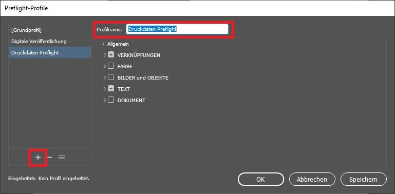 Schritt 3: Im Profile-Fenster klicken Sie nun auf das kleine Plus-Symbol und legen ein neues Profil an. Bennen Sie dieses Profil. In diesem Beispiel heißt es „Druckdaten Preflight“. Anschließend definieren Sie, welche Aspekte Ihrer Druckdaten Sie prüfen möchten. Beispielsweise können Sie sich fehlende Verknüpfungen, falsche Farbräume, Übersatztexte, Überdrucken-Einstellungen, ICC-Profile und zahlreiche weitere potenzielle Fehlerquellen anzeigen lassen.
