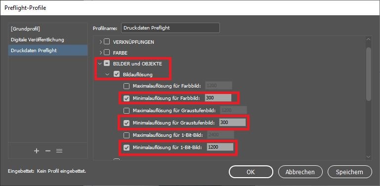 Um ausschließlich die Auflösung Ihrer Bilder und Pixelgrafiken zu kontrollieren, öffnen Sie den Punkt BILDER und OBJEKTE und dann setzen dann einen Haken bei Bildauflösung. Setzen Sie hier die Werte aus dem Datenblatt Ihres Produktes ein, zum Beispiel 300 ppi bei der minimalen Auflösung für Farbbilder sowie Graustufenbilder und 1.200 für 1-Bit-Bilder. Danach klicken Sie auf Speichern und Ok.