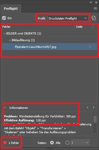 In der linken unteren Ecke des Panels wird neben dem roten Punkt die Gesamtzahl der Fehler im Dokument angezeigt. In diesem Fall liegt nur 1 Fehler vor. Klappen Sie nun die angezeigten Dropdown-Menüs aus und sehen Sie sich die Ergebnisse des Checks an. In diesem Fall liegt beim Dokument „Flyeralarm Leuchtturm1917“ ein Problem bei der Bildauflösung vor. Die kleine orangefarbene Zahl gibt an, auf welcher Seite Ihres Dokuments der Fehler liegt. In diesem Fall auf der ersten Seite.