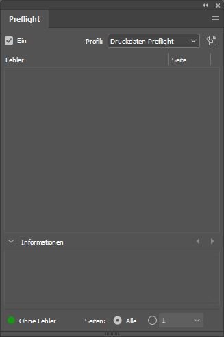 Schritt 1: Um das Preflight-Panel anzeigen zu lassen, klicken Sie auf Fenster, Ausgabe und Preflight. Anschließend öffnet sich das Preflight-Panel, das standardmäßig deaktiviert ist. Setzten Sie deshalb einen Haken bei Ein.