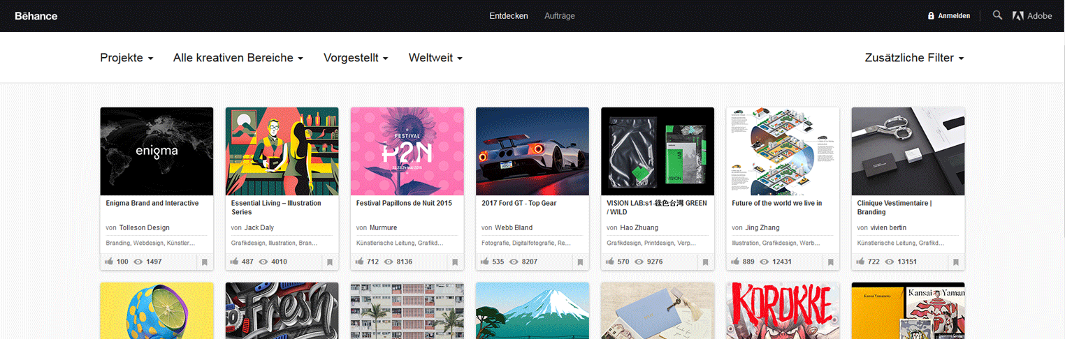 Auf dieser Plattform können Sie nicht nur Ihr eigenes Portfolio online erstellen, sondern auch ausgedehnt in denen anderer User stöbern. Dazu gibt es zahlreiche Kategorien, nach denen Sie filtern können, von Animation über 3D-Modelierung bis hin zu Verpackung. Vor allem bietet es jedoch auch etliche Beispiele aus dem Print Design und der Werbung, die Sie als Inspirationsquelle nutzen können. Dies schließt entsprechend auch Dinge wie Logogestaltung, Layoutaufbau oder Corporate Design ein.