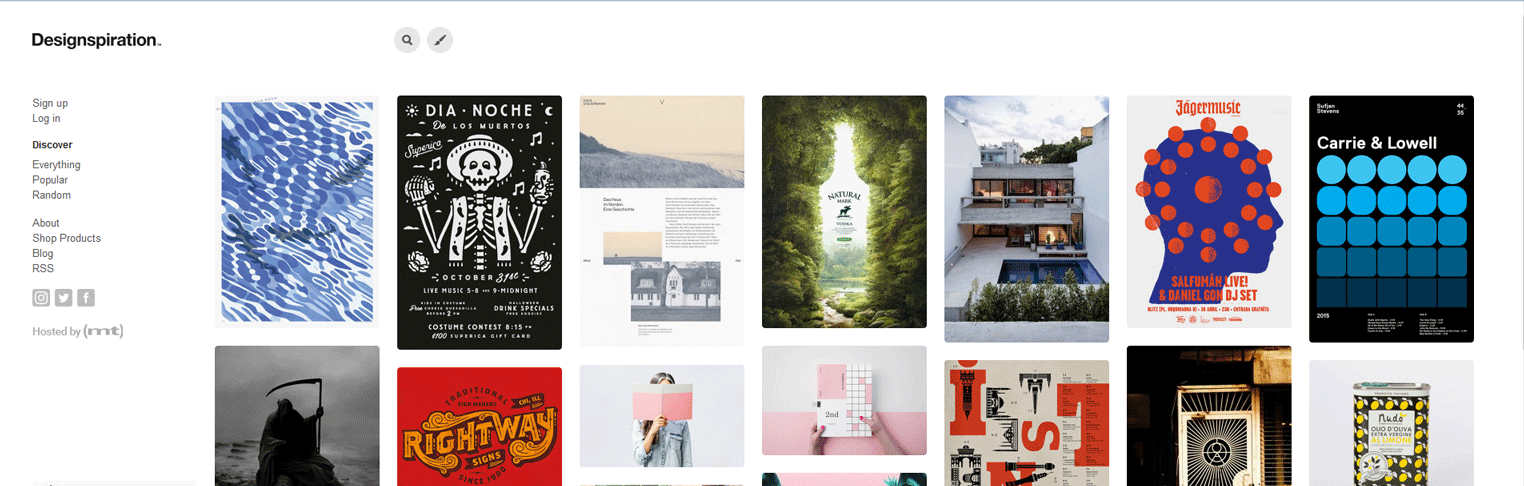 Ähnlich wie Behance oder Pinterest bietet auch Designspiration eine vielfältige und bunte Mischung von Layouts und Artwork. Querbeet werden hier zahlreiche Stilrichtungen und verschiedenste Anwendungsbeispiele bedient. Allerdings lassen sich diese nur nach „Everything“, „Popular“ und „Random“ sortieren. Dafür ist die farbspezifische Suche überaus praktisch. So können Sie bis zu fünf Farben wählen und erhalten passende Designs in genau diesen Kombinationen.