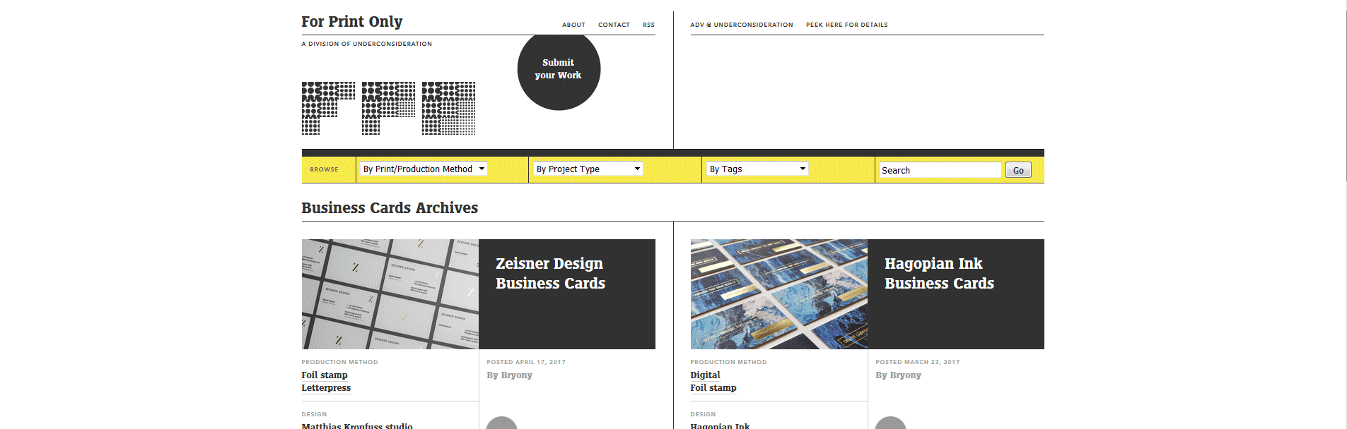 Wie der Name schon sagt, ist dies eine speziell für Druckprodukte angelegte Seite, auf der jede Menge Beispiele und Ideen vorgestellt werden. Meist sind dies reale Aufträge, die die Uploader auch beschreiben, also was sie sich bei den Layouts gedacht haben oder wie der Entstehungsprozess abgelaufen ist. Kommen Sie als Besucher auf die Seite, können Sie die angezeigten Beiträge in zwei Sparten selektieren. Zum einen haben Sie die Möglichkeit, nach Druck- bzw. Produktionsmethoden zu wählen, was auch Veredelungen mit einschließt. Zum anderen können Sie ein spezielles Produkt oder einen Anwendungszweck wählen, also zum Beispiel Broschüren, Visitenkarten oder Kalender bzw. Promotion, Ankündigungen oder Einladungen.
