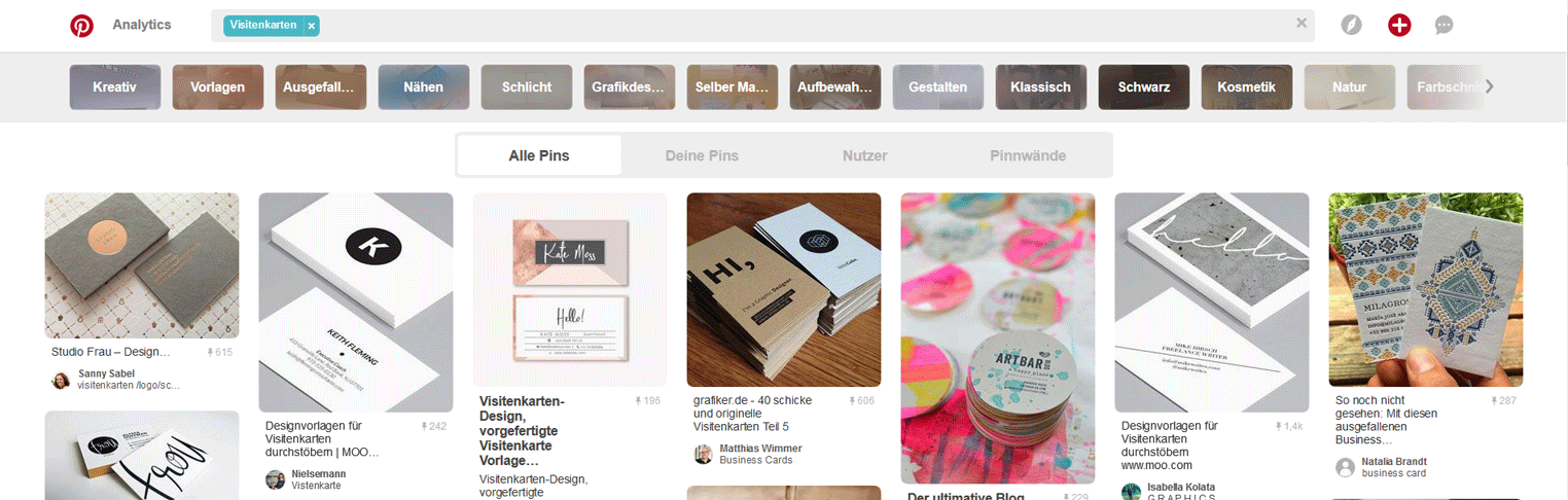 Pinterest bezeichnet sich selbst als einen „Katalog unendlich vieler Ideen“. Dem ist eigentlich nichts weiter hinzuzufügen, schließlich ist das Netzwerk in den letzten Jahren zu einem der wichtigsten Social-Media-Anlaufstellen geworden. Dementsprechend groß ist die Zahl der Pins, die in verschiedensten Kategorien gesammelt werden und dementsprechend sind diese gefüllt mit allen möglichen Inhalten. Nutzen Sie daher am besten die Suche, nicht nur, aber vor allem, wenn Sie nach etwas Bestimmtem Ausschau halten. Allein schon, weil Ihnen praktische Vorschläge zur Ergänzung des eingegebenen Begriffs geliefert werden. Suchen Sie beispielsweise nach „Visitenkarten“, schlägt Ihnen die Seite bestimmte Branchen, Farben oder Gestaltungsmerkmale vor, nach denen Sie zusätzlich selektieren können. Größter Nachteil von Pinterest: Ohne Registrierung bleibt man blind.