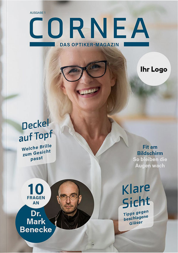 Warum sollten Ihre Kunden eine Gleitsichtbrille nicht gleich beim Schmökern in Ihrem hauseigenen Kundenmagazin testen? Eben! Im Inneren befinden sich Trend-Analysen, informative Beiträge zu Fördermöglichkeiten für Arbeitsbrillen, Interviews und natürlich Ihr eigener Content.