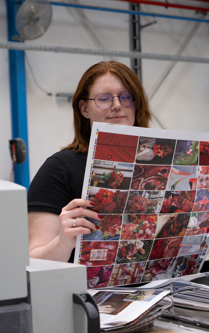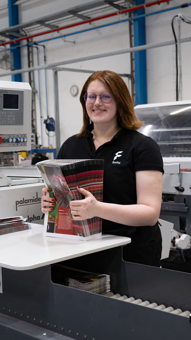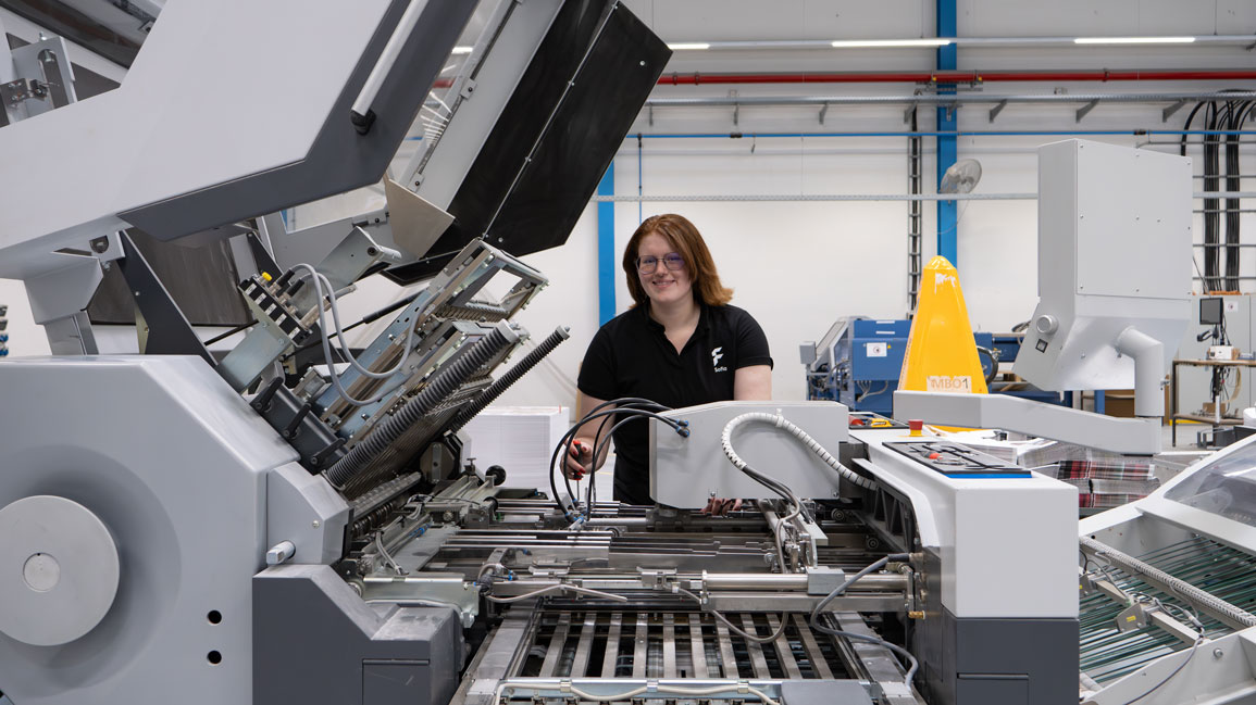 Handwerkliches Geschick, ausgeprägtes Feingefühl und gute Augen – darauf kommt es bei der Ausbildung zum Medientechnologen in der Druckweiterverarbeitung an. Zum einen muss man zahlreiche unterschiedliche Maschinen bedienen und programmieren, zum anderen aber auch die fertigen Drucksachen kontrollieren: Jeder noch so filigrane Falz muss exakt passen, Schnittmarken müssen genau getroffen werden – und in Zweifelsfall muss man die Feinjustierung der Maschine selbst vorzunehmen. „Und man sollte sich natürlich nicht scheuen, einfach mal die Kolleginnen und Kollegen um Hilfe zu fragen, wenn man sie denn braucht“, findet Sofia Benks. „Hier in unserer Produktionshalle hat man nämlich viele nette Menschen um sich herum, die gerne weiterhelfen.“