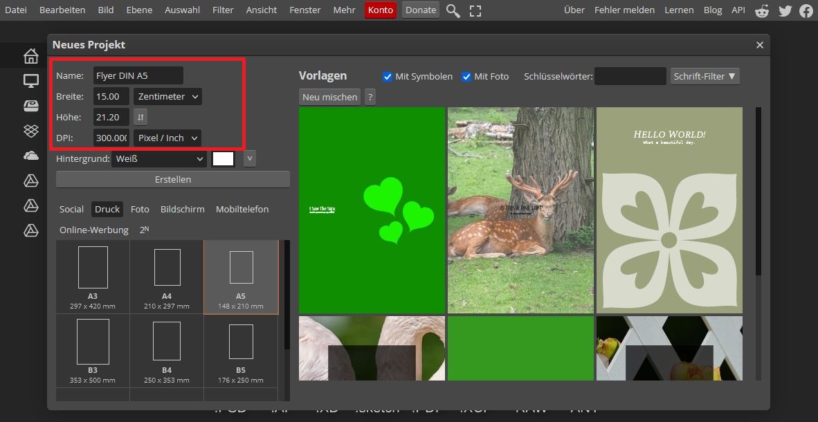 Schritt 2: Anschließend öffnet sich ein neues Fenster, in dem Sie Ihr Dokument anlegen. Hier legen Sie zum Beispiel die Breite und Höhe Ihres Druckproduktes fest, geben die PPI-Zahl an, vergeben einen Namen und haben sogar die Möglichkeit, eine kostenlose Gestaltungsvorlage zu suchen.
