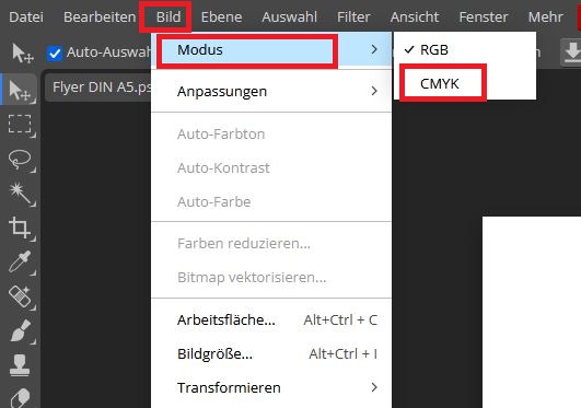 Schritt 1: Um eine möglichst genaue Vorschau Ihres Druckproduktes am PC zu erhalten, sollen Sie direkt von Anfang an im CMYK-Modus arbeiten. Klicken Sie dazu auf Bild, Modus und dann CMYK.