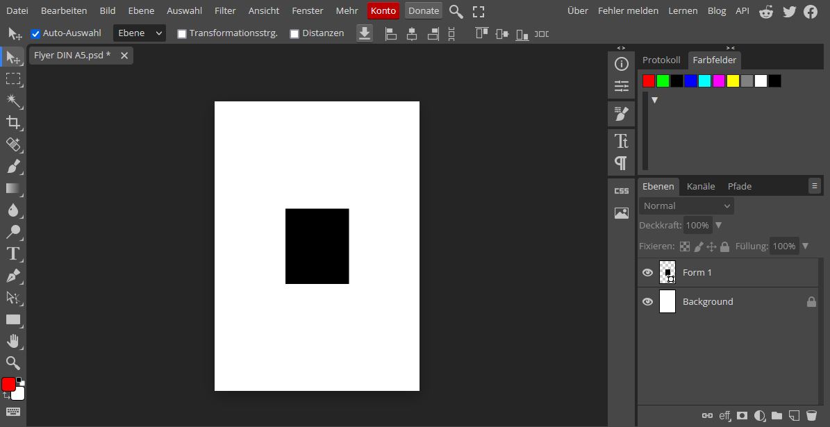 Anschließend gestalten Sie Ihre Druckdaten frei nach Ihren Vorstellungen. Für einfache Flyer, die Sie mit Texten, Grafiken, Logos oder Wappen versehen möchten, taugt das Online-Bildbearbeitungsprogramm auf jeden Fall. Wenn Sie sich bereits mit Adobe Photoshop oder Affinity Foto auskennen, wird Ihnen die gesamte Nutzeroberfläche bekannt vorkommen: Links befindet sich die Werkzeugleiste, rechts Ebenen-, Farb- und Kanäle-Fenster und in der Menüleiste oben wählen Sie die detaillierten Funktionen und Modi aus.