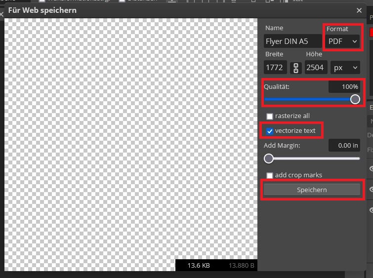 Außerdem sollten Sie ein Häkchen bei vectorize text setzen, so werden Ihre Textelemente vektorisiert. Anschließend klicken Sie auf Speichern und schon wird Ihre Druckdatei automatisch heruntergeladen.