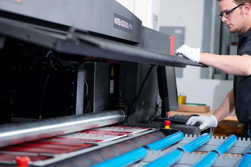 Pappaufsteller werden, wie viele andere Werbetechnikartikel auch, im Digitaldruckverfahren bedruckt. Ähnlich wie bei Tintenstrahldruckern wird die Farbe direkt auf das Trägermaterial gesprüht. Reihe für Reihe fahren in der Druckmaschine Farbdüsen über das Produkt und tragen die Farbe auf, bis am Ende das von Ihnen angelegte Layout übertragen ist. Die Digitaldruckmaschinen verfügen über verschiedene Profile, die, je nach zu bedruckendem Material, ausgewählt werden. So weiß der Drucker jederzeit, wie viel Farbe aufgetragen werden muss oder wie schnell die Farbdüsen über die Produktoberfläche fahren müssen, um ein optimales Druckbild zu erzeugen.