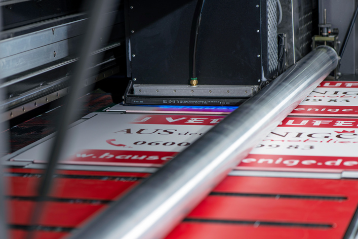 Pappaufsteller werden mit speziellen UV-Farben bedruckt. Die sind robust, lassen sich im Digitaldruckverfahren gut auftragen und mit UV-Strahlern schnell trocknen. Speziell diese Eigenschaft ist wichtig, da die Pappaufsteller nach dem Druck direkt zur Schneidemaschine transportiert werden. Diese funktioniert vollautomatisch: Aus Ihrem Druckbild wird zuerst eine Schnittvorlage generiert. Auf das Trägermaterial wird außerhalb des von Ihnen entworfenen Layouts ein Barcode gedruckt. Anhand des Barcodes, den ein Mitarbeiter im nächsten Schritt einscannt, wird die passende Schnittvorlage in die Schneidemaschine geladen. Der Schneidekopf fährt nun automatisch die Schnittkontur ab und separiert mittels einer extrem scharfen Klinge die Form Ihres Pappaufstellers vom Trägermaterial. Danach wird der fertige Pappaufsteller verpackt und versendet.