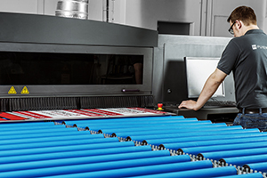 Dieses Druckverfahren wurde speziell für den Plattendruck entwickelt und hat neue Maßstäbe in Sachen Schnelligkeit, Qualität und Haltbarkeit gesetzt. Während beim digitalen Tintenstrahldruck die Tinte in das Material eindringt und beides nach dem Druck erst einmal trocknen muss, bleibt beim digitalen UV-Druck die Tinte auf dem Material und wird noch in der Druckmaschine mit UV-Licht gehärtet. Das spart zusätzliche Trocknungszeiten. In Sachen Trocknung geht die neue VUTEk-Technologie sogar noch einen Schritt weiter: Neben den UV-Lampen, die während des Trocknungsvorgangs eine hohe Temperatur erzeugen, sind in der EFI VUTEk ® HS100 Pro zusätzlich LED-Lampen mit Kaltlicht zur Trocknung integriert. So können auch hitzeempfindliche Materialien wie beispielsweise Schaumstoffe bedruckt werden.