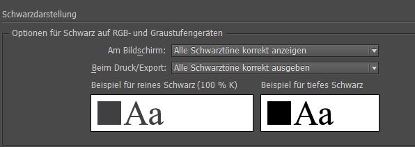 Das generelle Problem einer adäquaten Vorschau des Druckergebnisses am Bildschirm erhöht sich bei Schwarz nochmals. Auch ein verlässlicher Softproof stößt hier an seine Grenzen, denn so marginal die Unterschiede am Monitor erscheinen, so gravierend können sie im Druck zu Tage treten. In InDesign gibt es zumindest ein wenig zusätzliche Hilfe: Stellen Sie unter Bearbeiten > Voreinstellungen > Schwarzdarstellung „Alle Schwarztöne korrekt anzeigen“ bzw. auch „Alle Schwarztöne korrekt ausgeben“ ein.
