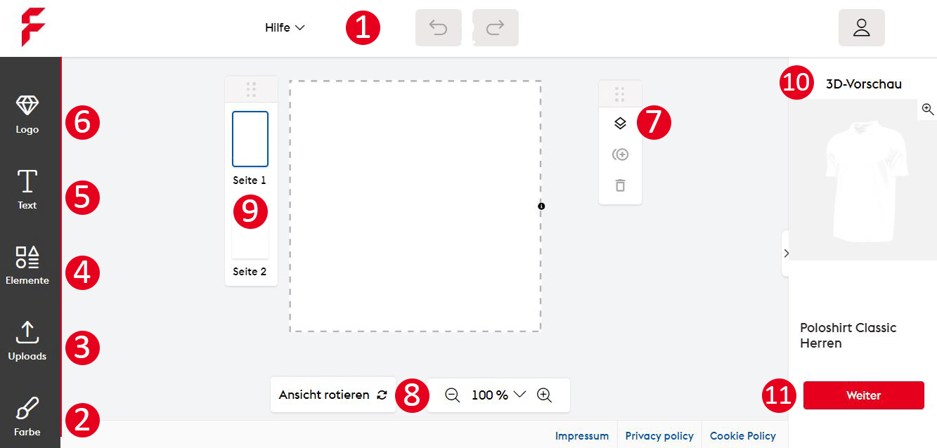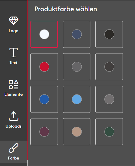 In der linken Werkzeugleiste finden Sie sämtliche Werkzeuge, die Sie für Ihre Gestaltung benötigen. Um sich ein besseres Bild von Ihren fertigen T-Shirts zu machen, empfiehlt es sich, mit der Basisfarbe des Stoffes zu beginnen. Je nach Modell kann sich die Farbauswahl unterscheiden. Die Grundfarbe können Sie auch während des Gestaltens jederzeit verändern.