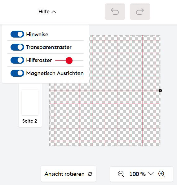 Direkt neben dem Hilfe-Menü finden Sie zwei Pfeiltasten. Mit ihnen können Sie bei Bedarf während des Erstellens Ihres Layouts einzelne Schritte rückgängig machen oder wieder herstellen.