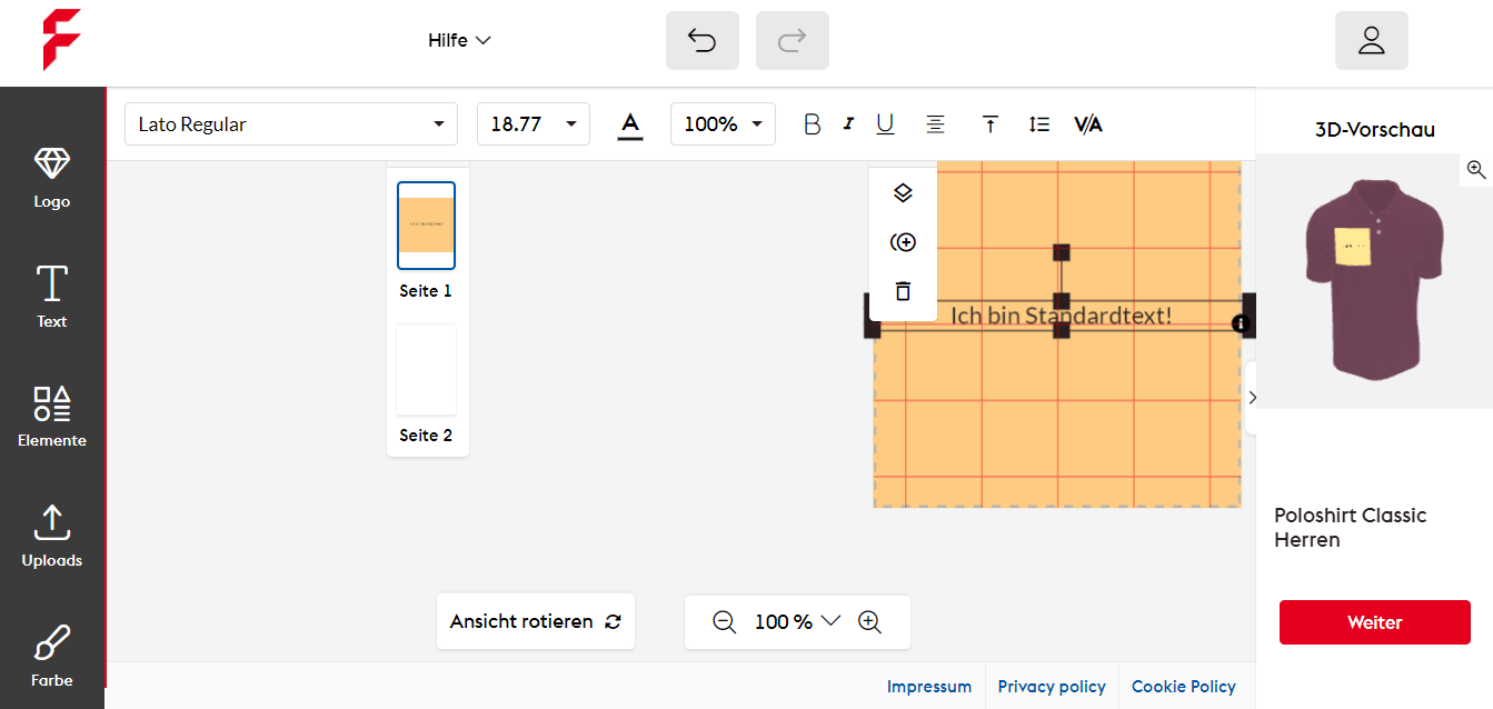 Verpassen Sie Ihren T-Shirts die richtige Aufschrift. Dafür wählen Sie zuerst einen Standardtext aus und ziehen ihn mit der Maus auf Ihre Arbeitsfläche. Danach ändern Sie ihn inhaltlich ab und formatieren ihn mit Hilfe der verschiedenen Schriftarten, Farben und weiterer Optionen in der oberen Leiste.