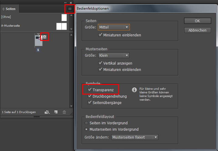 Um zu überprüfen, ob überhaupt Transparenzen vorhanden sind, können Sie in InDesign das Seiten-Menü dahingehend anpassen: Aktivieren Sie in den Bedienfeldoptionen das Symbol für Transparenz, damit es im Seiten-Bedienfeld angezeigt wird. Ab sofort zeigt ein kleines kariertes Rechteck an, wenn Transparenzen auf der jeweiligen Seite vorhanden sind.