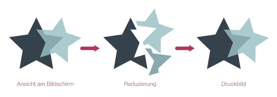 Transparenz entsteht, wenn eine Grafik oder ein Text nicht zu 100 % deckend über einem anderen Element platziert wird. Bei der Reduzierung werden die einzelnen Teile, die das Gesamtbild ergeben, aufgeteilt und auf eine Ebene reduziert, also in für die Druckmaschine verarbeitbare Informationen umgewandelt. Konkret heißt das, sie werden in Pixel konvertiert bzw. in Segmente zerschnitten und unterschiedlich eingefärbt.