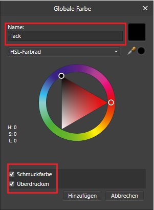 Schritt 3: Anschließend öffnet sich ein neues Fenster. Geben Sie hier den im Datenblatt Ihres Produktes angegebenen Namen für die neue Volltonfarbe ein. Im Farbrad wählen Sie eine beliebige Farbe aus. Setzen Sie nun einen Haken bei Schmuckfarbe und je nach Veredelung auch einen Haken bei Überdrucken.