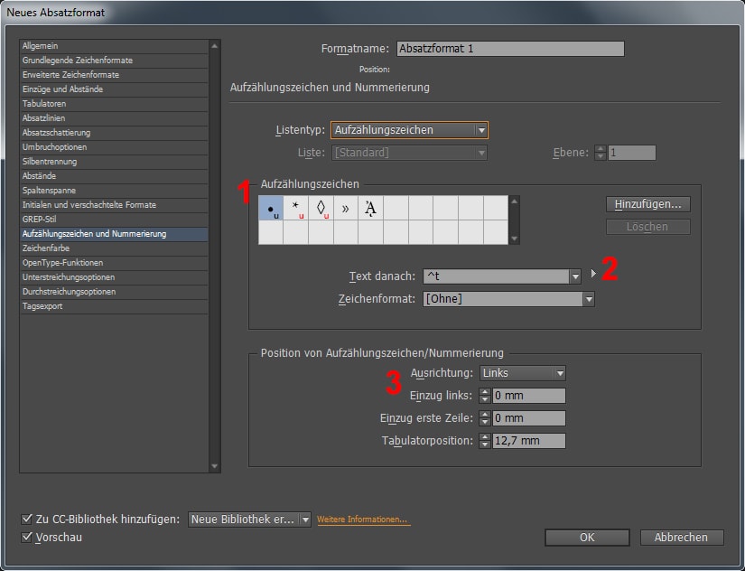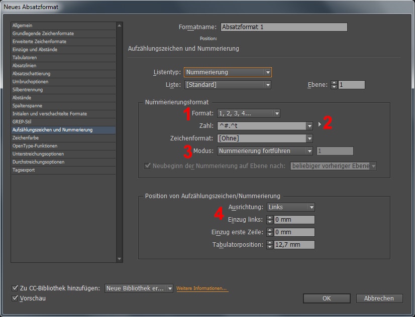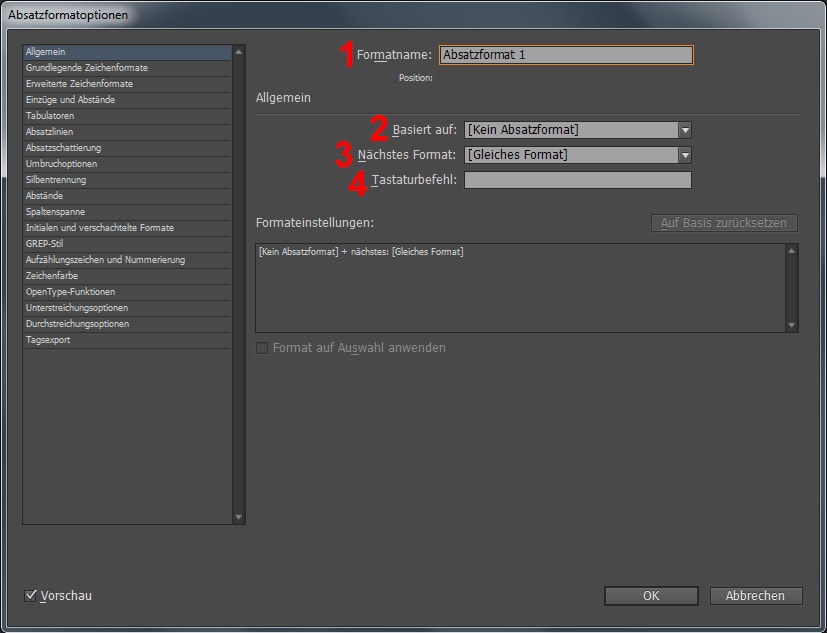 - Legen Sie einen Namen für Ihre Absatzformate fest (1).