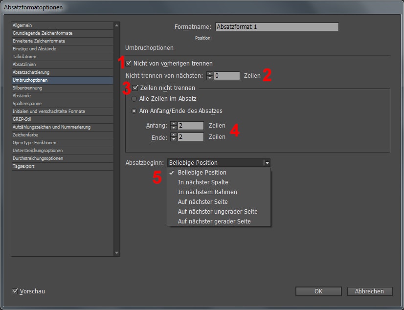 - Bestimmen Sie über „Absatzbeginn“, wo der Absatz beginnen soll. Er wird dann entsprechend verschoben. „Beliebige Position“ richtet sich nach den Einstellungen bei „Zeilen nicht trennen“ (5).