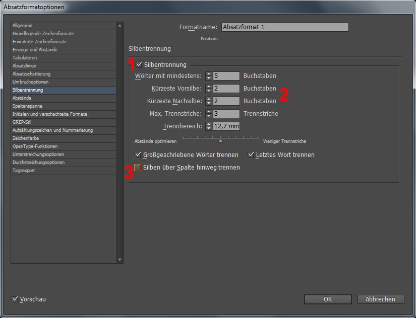 - Deaktivieren Sie „Silben über Spalte hinweg trennen“, wenn Sie nicht möchten, dass Wörter über zwei Spalten, Rahmen oder Seiten laufen (3).