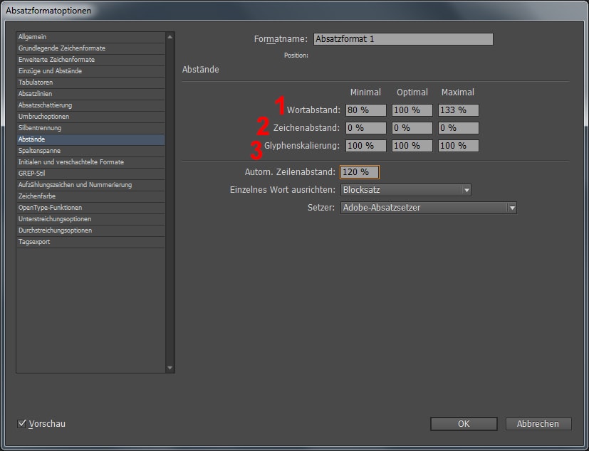 - Bei „Wortabstand“ legen Sie die Breite eines Leerzeichens im Optimalfall fest und wie viel Abstand minimal und maximal zwischen zwei Wörtern sein darf (1).