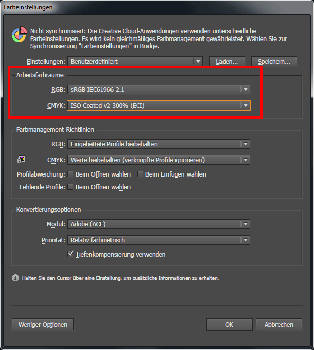 Sollten die genannten Farbprofile nicht voreingestellt in Illustrator zur Auswahl stehen, gehen Sie wie folgt vor: Öffnen Sie Adobe InDesign und navigieren Sie zu den Farbeinstellungen. Wählen Sie hier z. B. ISO Coated v2 300% im CMYK-Farbraum aus und klicken Sie rechts auf „Speichern“. Speichern Sie das Farbprofil unter einem gewünschten Namen (z. B. „Offset“) ab und behalten Sie den Speicherort im Hinterkopf. Nun starten Sie Illustrator, wählen im Menü Bearbeiten > Farbeinstellungen und klicken rechts auf den Button „Laden“. Navigieren Sie zum eben gemerkten Speicherort und wählen Sie Ihr Farbprofil aus, um die Einstellungen aus InDesign zu übernehmen. Fertig!