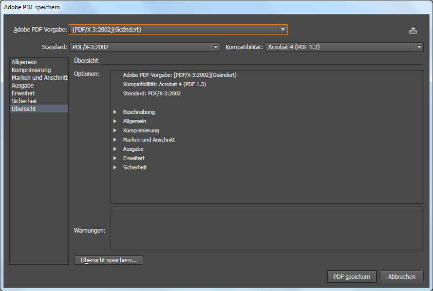 Haben Sie die Gestaltung Ihres Produktes abgeschlossen, wählen Sie im Menü Datei > Speichern unter. Geben Sie in dem sich öffnenden Fenster Ihrer Datei einen Namen und wählen Sie als Dateityp „Adobe PDF“ aus. Sie gelangen nun zu den Export-Einstellungen mit den folgenden Kategorien: