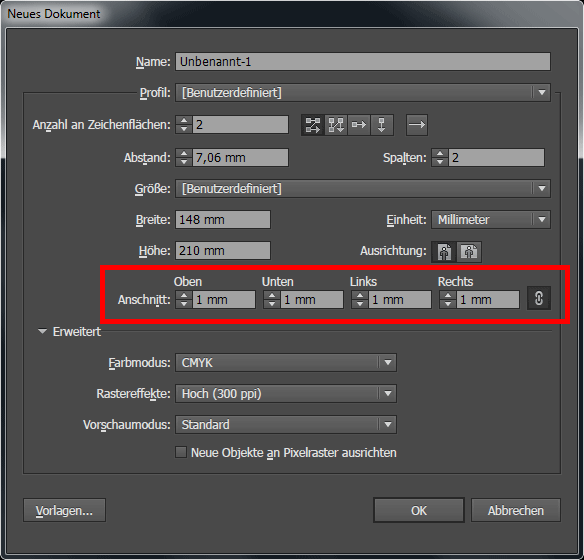 Legen Sie die Eckdaten für Ihr Dokument fest. Geben Sie bei „Breite“ und „Höhe“ das Endformat Ihres gewählten Produktes ein und bei „Anschnitt“ die Beschnittzugabe, wie Sie sie im entsprechenden Datenblatt zum Produkt finden. Im Beispiel legen wir einen DIN A5 Flyer an, der auf jeder Seite 1 mm Beschnittzugabe erfordert. Diese wird im Dokument schließlich als rote Linie gekennzeichnet, platzieren Sie Ihre Inhalte (Grafiken, Fotos, Hintergründe etc.) immer bis mindestens an diese rote Linie heran.