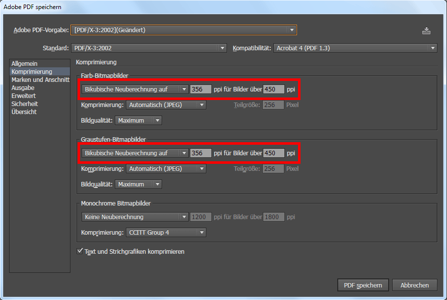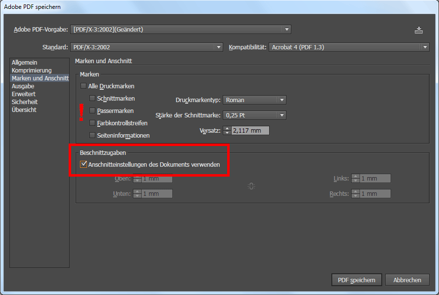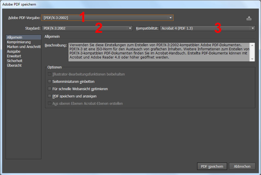 Wählen Sie als Adobe PDF-Vorgabe „PDF/X-3:2002“ aus (1) und stellen Sie unter Standard „PDF/X-3:2002“ (2) sowie unter Kompatibilität „PDF 1.3“ ein (3).