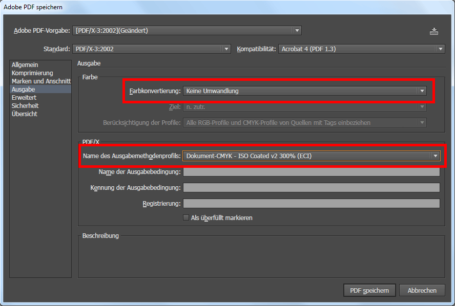 Wählen Sie bei Farbkonvertierung „Keine Umwandlung“ aus und kontrollieren Sie bei Name des Ausgabemethodenprofils, dass „ISO Coated v2 300%“ (bei Druckprodukten) bzw. „ISO Coated v2“ (bei Werbetechnikprodukten) eingestellt ist. Aufgrund der Voreinstellungen in Schritt 1 sollte das richtige Farbprofil jedoch bereits automatisch ausgewählt sein.
