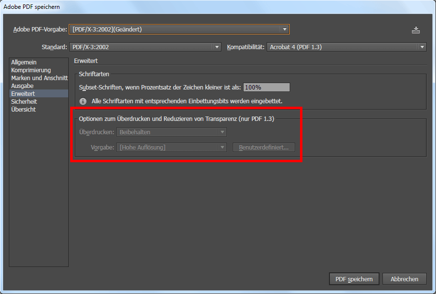 Eine Ausnahme bilden Daten, die zum Bedrucken von Bekleidung oder Baumwolltaschen gedacht sind. Diese müssen als PDF/X-4 exportiert werden.