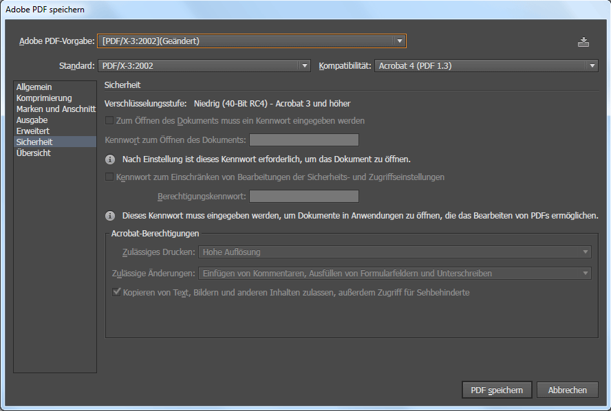 PDF/X-3:2002 (mit dem PDF-Format 1.3) hat übrigens eine maximale Zeichenfläche von 45 x 45 Zoll… d.h. wenn man Werbetechnik-Produkte mit mehr als 1,14 m in einer Dimension anlegt (z.B. ein Rollup mit einer Höhe von 2,00 m), dann kann kein maßstabgetreues PDF erzeugt werden. Wird dieses verlangt (es gibt auch Anbieter, die im Maßstab 1:2 oder 1:10 die Daten anfordern), dann muss man zwangsläufig auf das PDF-Format 1.6 umstellen und da landet man dann automatisch bei PDF/X-4. Oder irre ich mich? Hier müssten die Anforderungen für die Druckdaten-Erstellung überarbeitet werden.