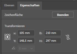 Im Gegensatz zu anderen Adobe-Programmen können Sie Höhe und Breite hier jedoch nicht direkt im sich öffnenden Fenster anpassen. Stattdessen müssen Sie im Reiter „Eigenschaften“ unter dem Punkt „Zeichenfläche“ und „Transformieren“ die Breite und Höhe eingeben.