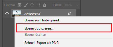 Schritt 1: Auch beim Kopierstempel sollten Sie grundsätzlich in der Kopie der Hintergrundebene arbeiten. Dazu klicken Sie rechts auf die Hintergrundebene und wählen „Ebene duplizieren…“.