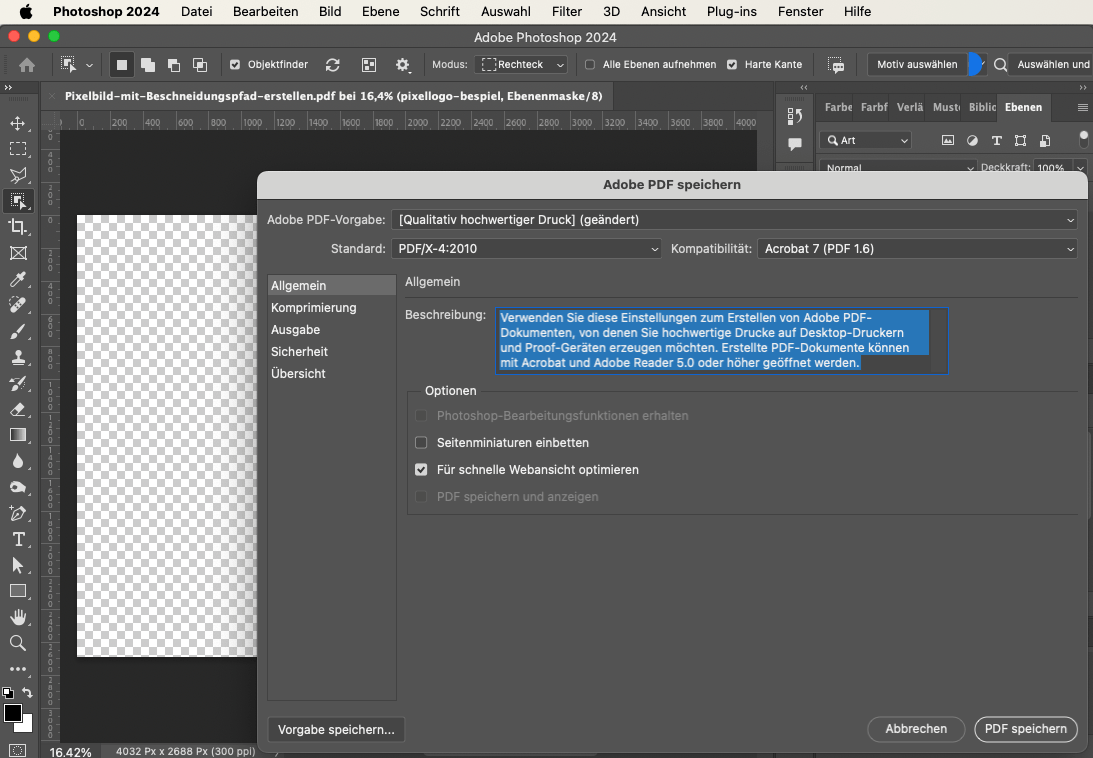 Ich habe mit Photoshop dieses Tutorial befolgt, frage mich aber, inwiefern die fertige pdf-Datei meine Vektorlinie (Die Ausschneidekontur) enthält, da der Pfad nicht mehr in der Pdf-Datei ist, wenn ich diese in Photoshop öffne. Alles, was sich verändert, ist dass automatisch alles außerhalb der Vektorlinie Durchsichtig bzw. weggeschnitten ist. Habe ich irgendetwas falsch gemacht? Weil sonst verstehe ich nicht, wofür ich die Vektorlinie mache, statt den Hintergrund einfach selbst entsprechend auszuradieren.
