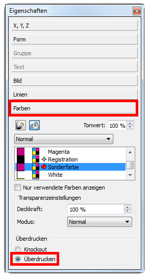 - Wählen Sie die Option „Überdrucken“ aus. (Ausnahme: Sonderfarben wie Gold und Silber)