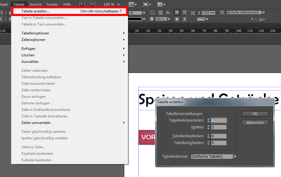 - Platzieren Sie eine Tabelle über Tabelle > Tabelle einfügen.